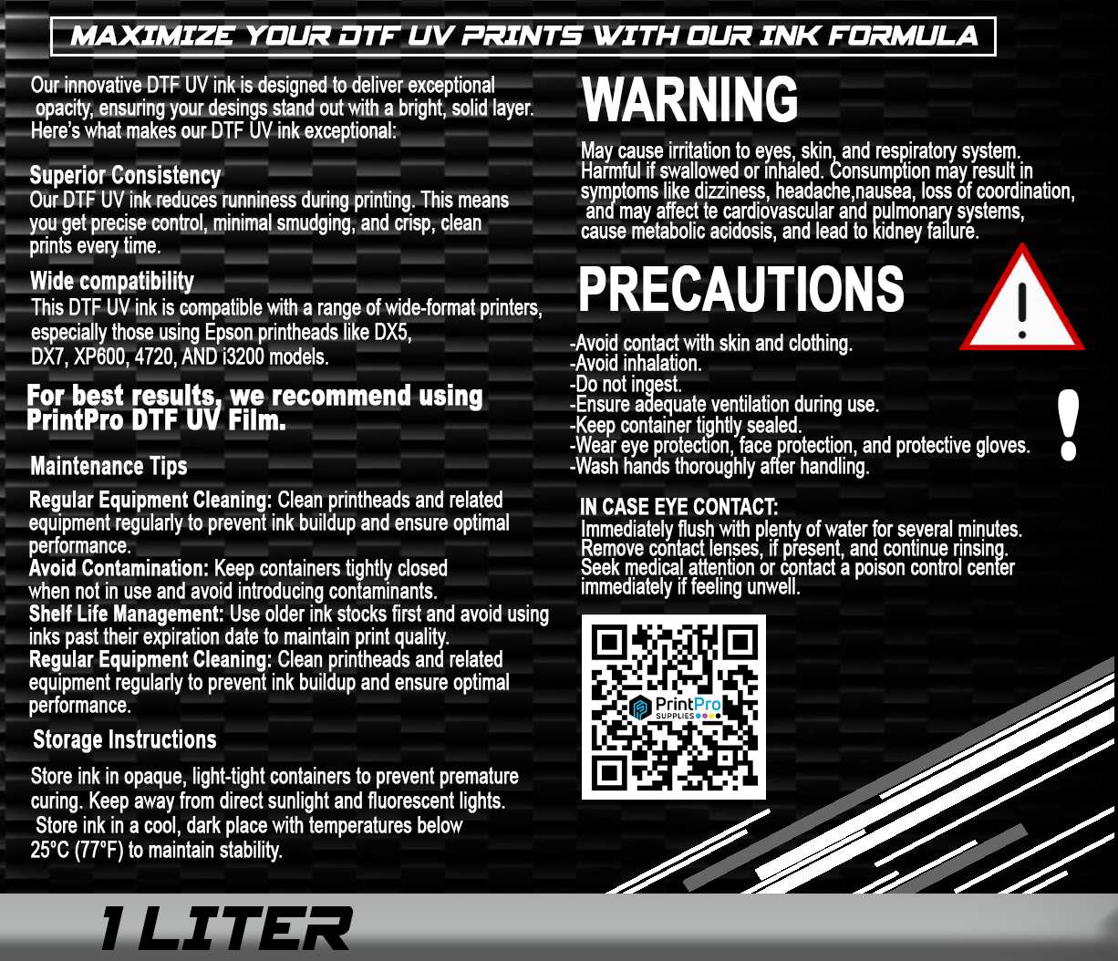 Discover the advanced UV ink solution designed for UV Direct-to-Film (DTF) printing with PrintPro ProGrade UV Ink. This premium UV ink is perfect for achieving high-quality prints with exceptional ease and consistency.