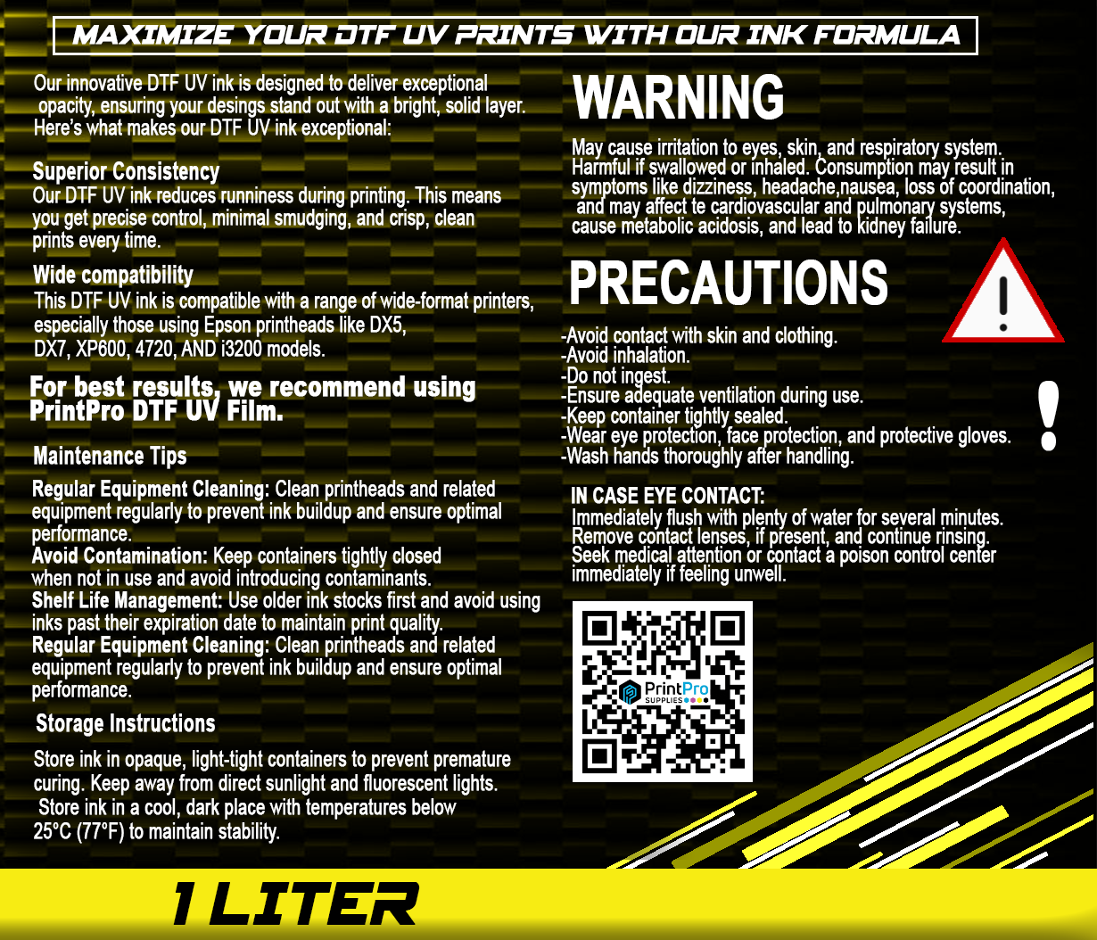 Discover the advanced UV ink solution designed for UV Direct-to-Film (DTF) printing with PrintPro ProGrade UV Ink. This premium UV ink is perfect for achieving high-quality prints with exceptional ease and consistency.